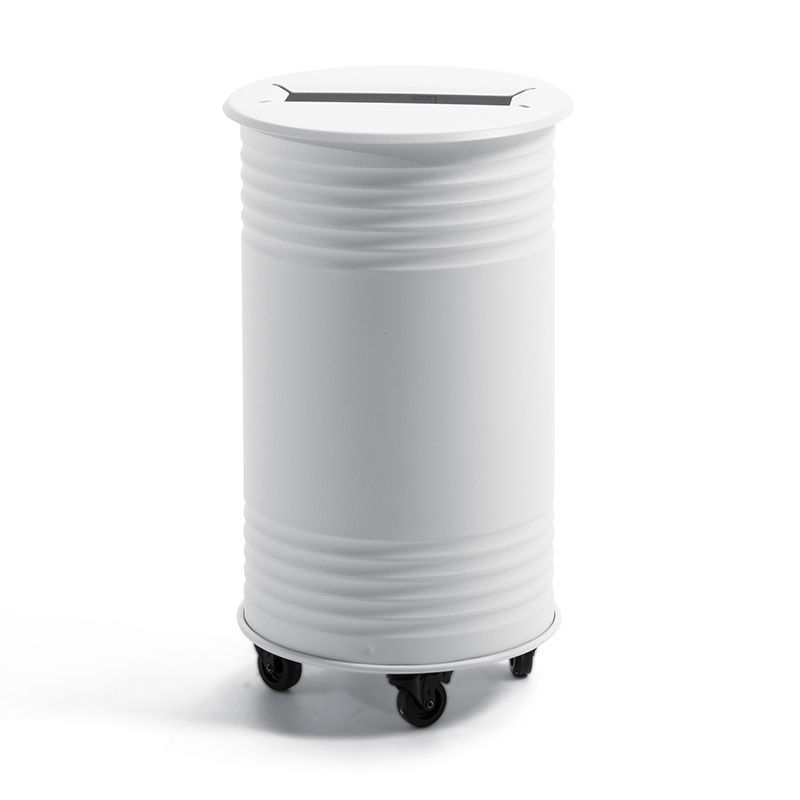 Affaldsbeholder Tin, H 600 mm, hjul, single, låg til papir, hvid. Affaldsbeholder Tin. En affaldsspand i topkvalitet med et design inspireret af tomme dåser, der er et stærkt symbol på affald.