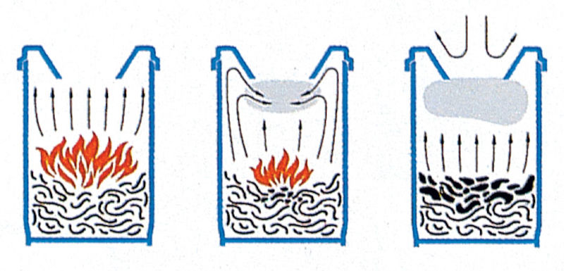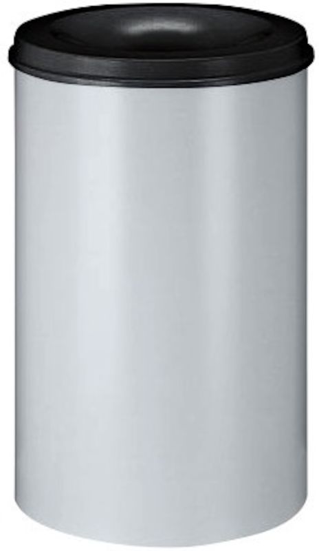 Affaldsspand Brandsikker, 110 l, sølv, højde 710 mm. Denne selvslukkende affaldsspand forhindrer, at der opstår brand. Skulle noget i den brandsikre affaldsbeholder fænge vil den røg som udvikler sig blive i spanden og danne en prop som holder ilten ude, hvilket leder til at ilden bliver kvalt. Korpus af stålplade, med farvet plastbelægning. Den selvslukkende top er af plastbelagt stålplade.