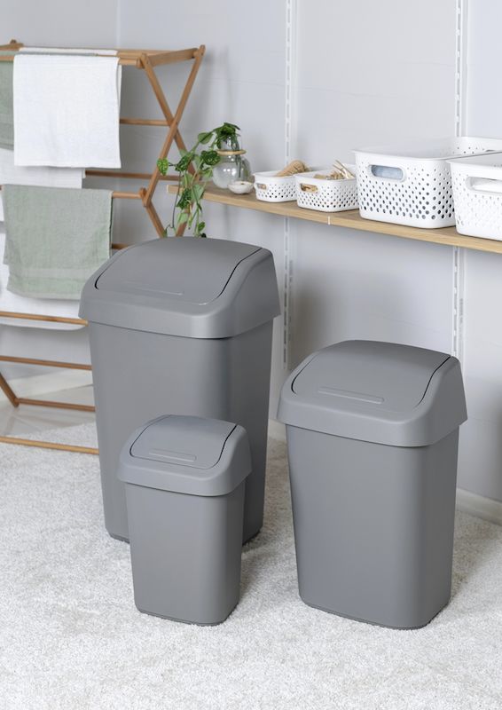 Affaldsspand med vippelåg til meget god pris. Skraldespanden er fremstillet i genbrugsplast (PP). Farve granit. Volumen 10, 25 eller 50 liter.