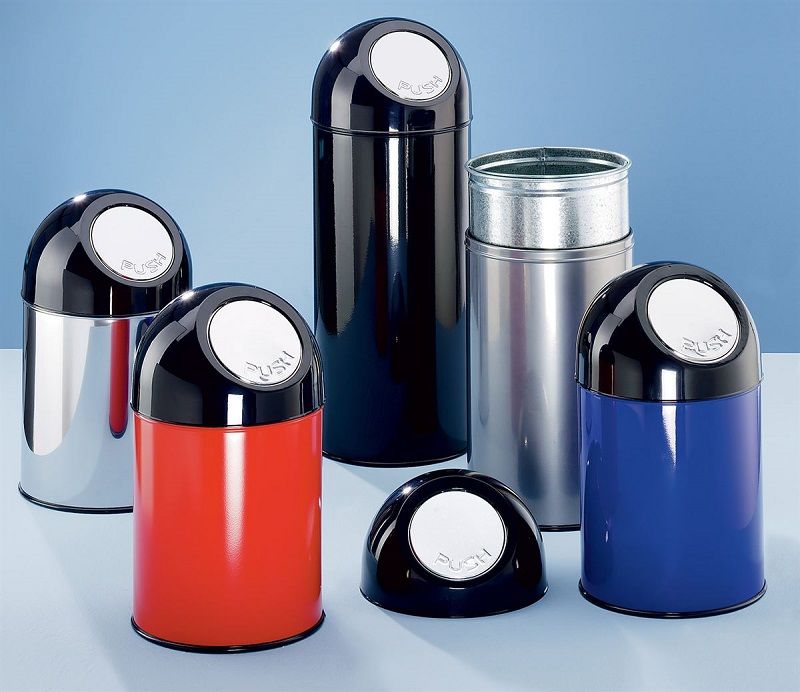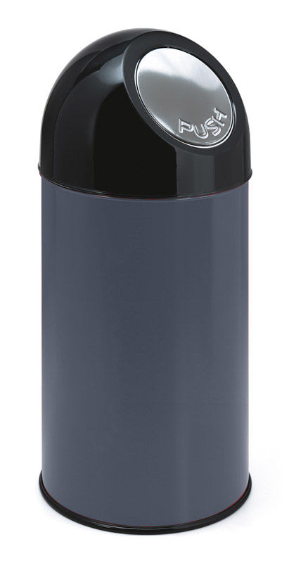 Affaldsspand PUSH, 40 l, stålplade, grå, højde 650 mm, uden inderspand. Skraldespand af enten farvet plastbeklædt stålplade eller rustfri stål. Affaldsspanden har sort top af slagfast plast med selvlukkende vippelåg af rustfrit stål. Affaldsspanden med låg kan fås med eller uden galvaniseret inderspand. Vippespanden har en sort plastring monteret på bunden til beskyttelse af gulvet. Holdbar og smart vippespande til en fornuftig pris.