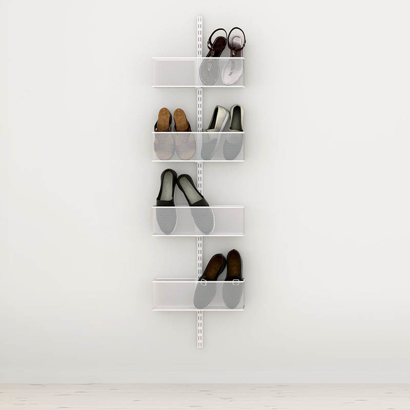 Hyldesystem ELFA Entréopbevaring 8, 1 hængeskinne, 4 Meshkurve. ELFAs klassiske opbevaringssystem til entréer og skabe. Består af bærelister, vægskinner, konsoller, hylder kurve og bøjlestang mm. Perfekt som tøjopbevaring i gangen eller skabe. Fås i forskellige komplette designs.