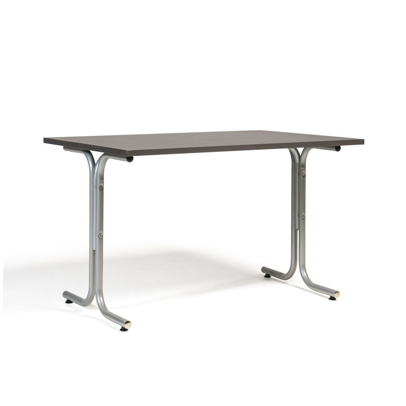 Kantinebord Vicky Square, LxB 1200x800 mm mørkegrå/sølv. Kantinebord Vicky, Funktionelle, rektangulære caféborde og kantineborde i flere størrelser fra 1200-1800 mm. Med indstillelige fødder så bordet kan stå på stabilt også på ujævne flader. Bordpladen er i laminat som er en holdbar overflade der tåler daglig brug. Stellet findes i krom, sortlakeret eller sølvlakeret.