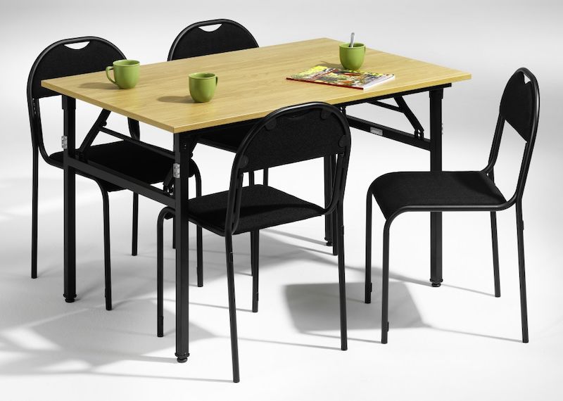 Klapbord Starko, 1200x500 mm, birk/sort. Klapbord med laminatplade og kraftigt stel med justerbare fødder. Sortlakeret bordstel i 30x30 mm stålrør, nemt at klappe op eller sammen. Stablingsafstandsstykker giver en god beskyttelse af bordpladen samt sikker og stabil stabling.