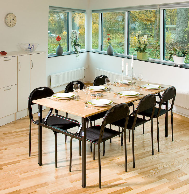 Klapbord Starko, 1400x600 mm, birk/sort. Klapbord med laminatplade og kraftigt stel med justerbare fødder. Sortlakeret bordstel i 30x30 mm stålrør, nemt at klappe op eller sammen. Stablingsafstandsstykker giver en god beskyttelse af bordpladen samt sikker og stabil stabling.