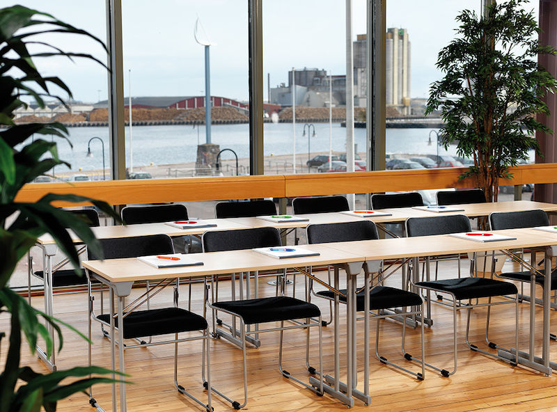 Stabile og kraftige mødeborde med sammenklappelige ben. Stellet består af flade stålrør for ekstra stabilitet. Udstyret med justerbare fødder.