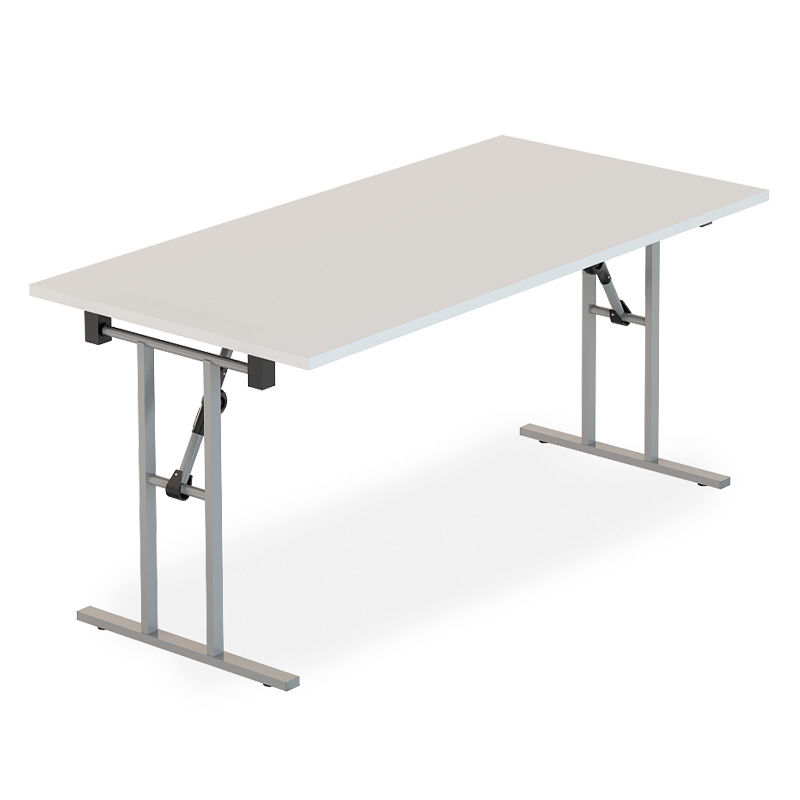Sammenklappeligt skrivebord Arve 1600x800x25 mm hvid/sølv. Et sammenklappeligt skrivebord, der er let at placere på midlertidige arbejdspladser. Tager minimal plads når bordene klappes sammen og stables. Bordene har T-stel så de er nemme at klappe sammen. Findes i forskellige designs og er fremstillet med sølvlakerede stålrør. Bordpladen er 18 resp. 25 mm tyk og har en holdbar overflade af laminat.