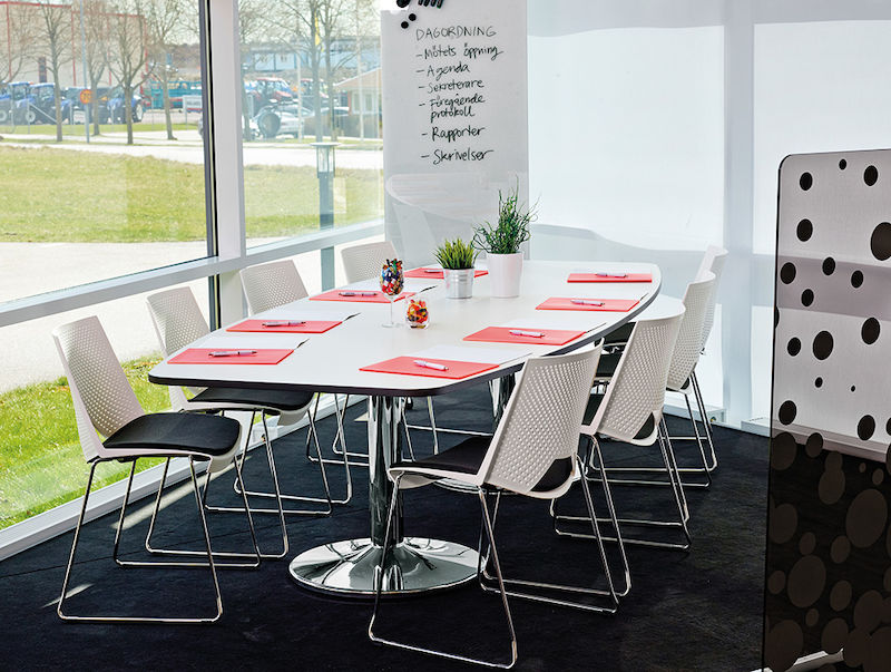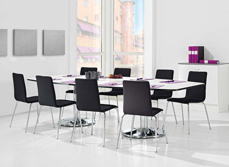 Elegant og stilrent mødebord med søjlestel. Let at få plads, ingen ben i vejen. Kombinerbart mødebord i moduler, kvadratiske midterplader og tillægsplader, der bliver smallere ud mod enden. Fås i flere størrelser.