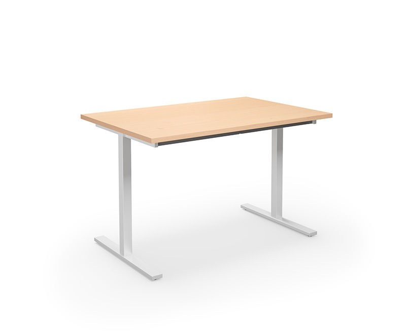 Stilrent skrivebord i moderne design, der er udstyret med en laminat bordplade, 25 mm tyk. T-formede pulverlakerede stålstel gør bordene stabile.