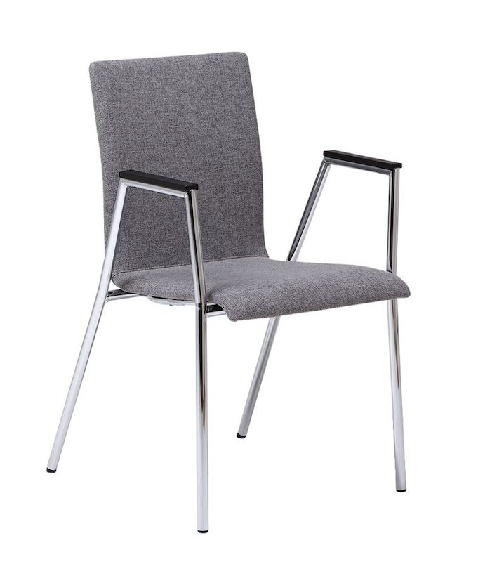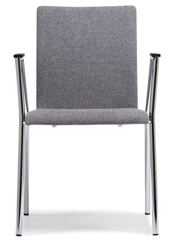 Konferencestol Cadeira med armlæn. Elegant mødestol med stel i krom og polstret sæde og ryg. Med rødt, sort eller gråt betræk. Armlæn i plast. Stabelbar for max 6 stole. Siddehøjde 455, siddebredde 500, siddedybde 453