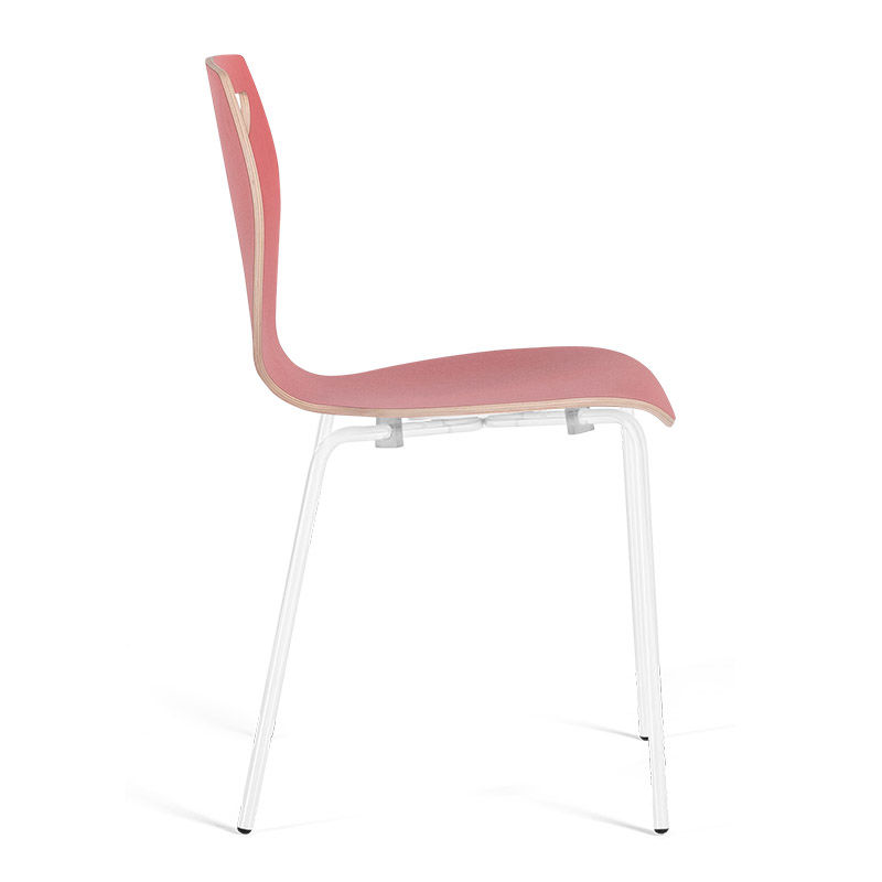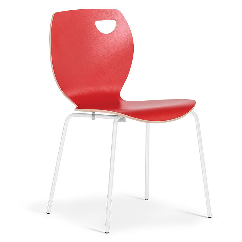 Skalstol, stabelbar Laura, kan stables, 4-pak, rød/hvid. Stabelbar skalstol, der er velegnet til kantinen og mødelokaler. Stolen fås i forskellige farver. Sæde og ryglæn består af ét stykke hårdt og robust højtrykslamineret træ. Stolen er udstyret med et forkromet eller lakeret stel i sort eller hvid.