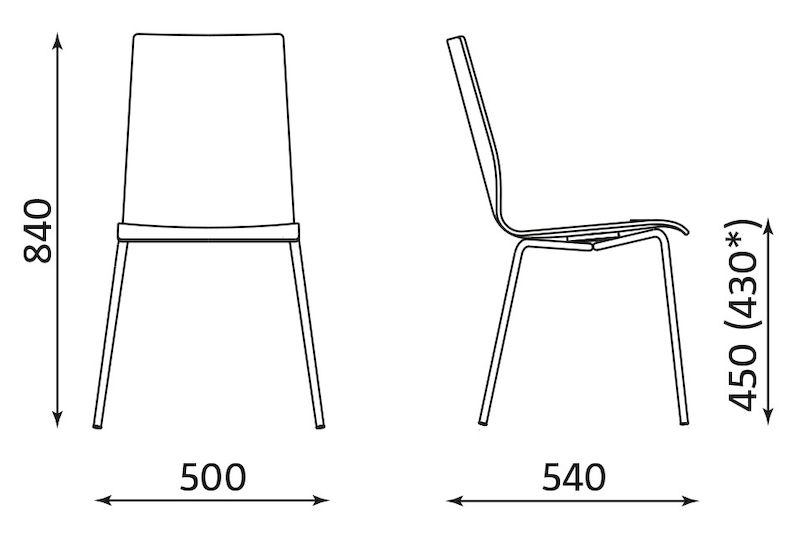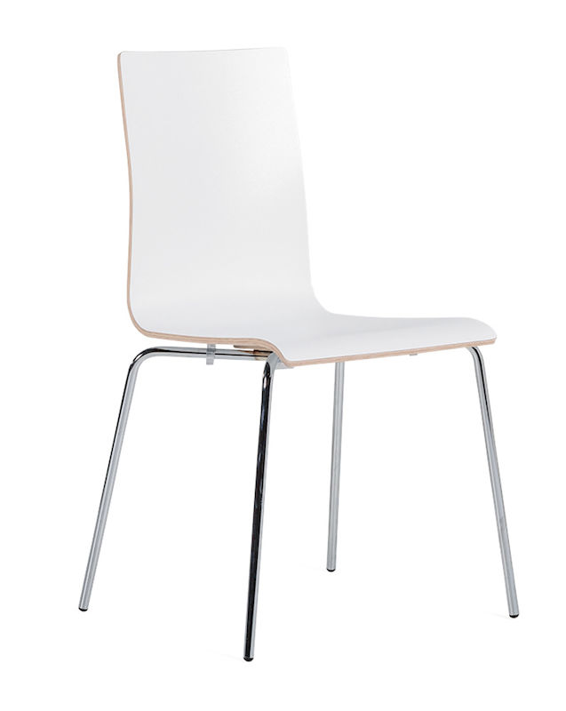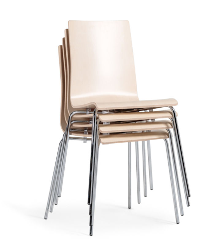 Sæde og ryglæn er udført i ét stykke hårdt og slidstærkt højtrykslamineret træ. Stolebenene er lavet af forkromede stålrør, hvilket gør stolene mere robuste og nemmere at gøre rent.