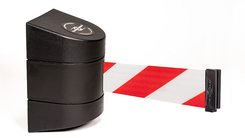Afspærringsbånd Tensabarrier vægmodel, 9 m, rød/hvid. Vægmodellen leveres inkl. vægbeslag.De udtrækkelige nylonbånd fås i blå, rød, sort og gul/sort.