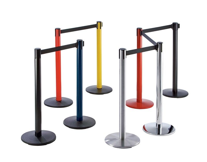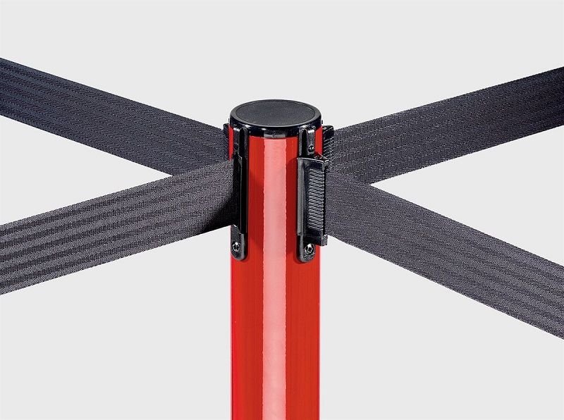 Afspærringsstolpe med bånd, stolpe i rustfrit stål. Vejled besøgende, afgræns områder, og afspær rum. Afspærringsstolpe med båndet overbeviser med topkvalitet og perfekt funktion. Alle systemer har et patenteret bremsesystem til afspærringsbåndet: Båndene trækkes blidt ind, sliddet på båndene bliver mindre, og derfor øges levetiden. En lås forhindrer utilsigtet løsning af båndet. Fod-Ø 345 mm. Stolpernes bånd kan kombineres med hinanden og med vægkassetten. 4-vejs-system. Sort afspærringsbånd. Stolpe og afdækning af matteret, rustfrit stål. Tung fod af støbegods, stolpehøjde 968 mm. Udtræk maks. 2300 mm, anbefalet 2000 mm.