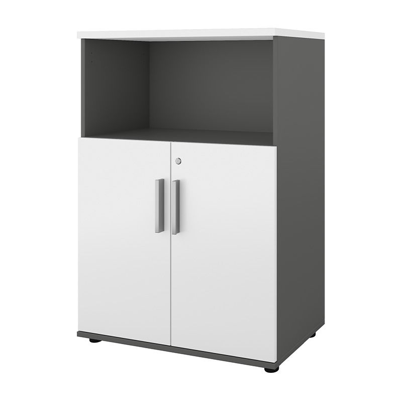 Kontorreol Portland, døre med lås, HxBxD 1138x800x420 mm, mørkegrå/hvid, dørhøjde 700 mm. Byder på opbevaring i to højder. Åben eller med forskellige døralternativer. Dørene leveres med en kraftig lås. Kabinetterne er fremstillet i hvid eller grå laminat og dørene findes i hvid, ahorn eller eg. Samtlige fødder er justerbare.