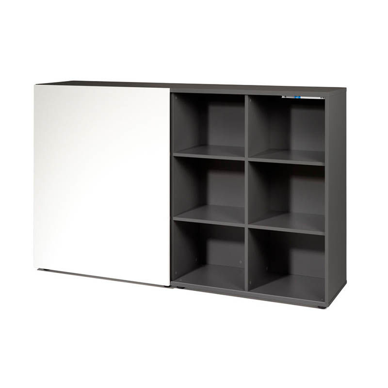 Kontorskab Edmonton, BxDxH 1800x450x1138 mm, mørkegrå/hvid. Opbevaring med 1 skydedøre. Kontorskabskabinetterne er fremstillet i hvid eller grå laminat og dørene findes i hvid, ahorn eller eg. Samtlige fødder er justerbare. Kan suppleres med 2 forskellige skuffeindsatser.