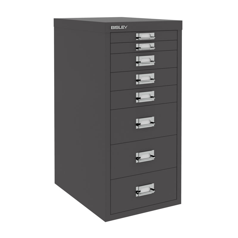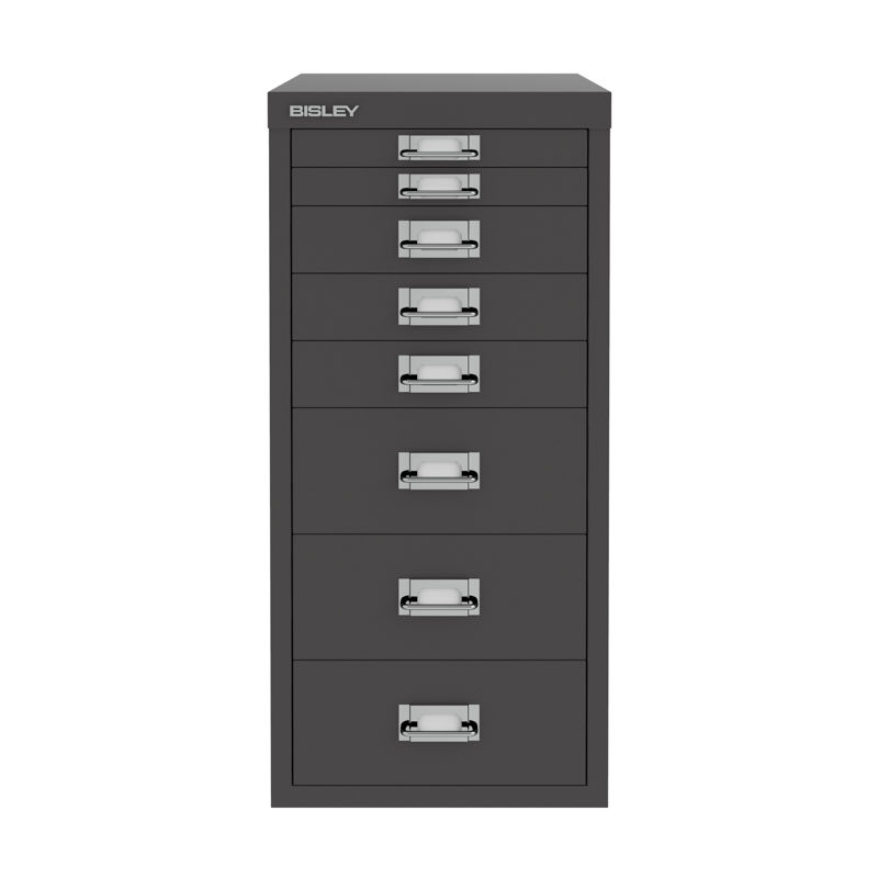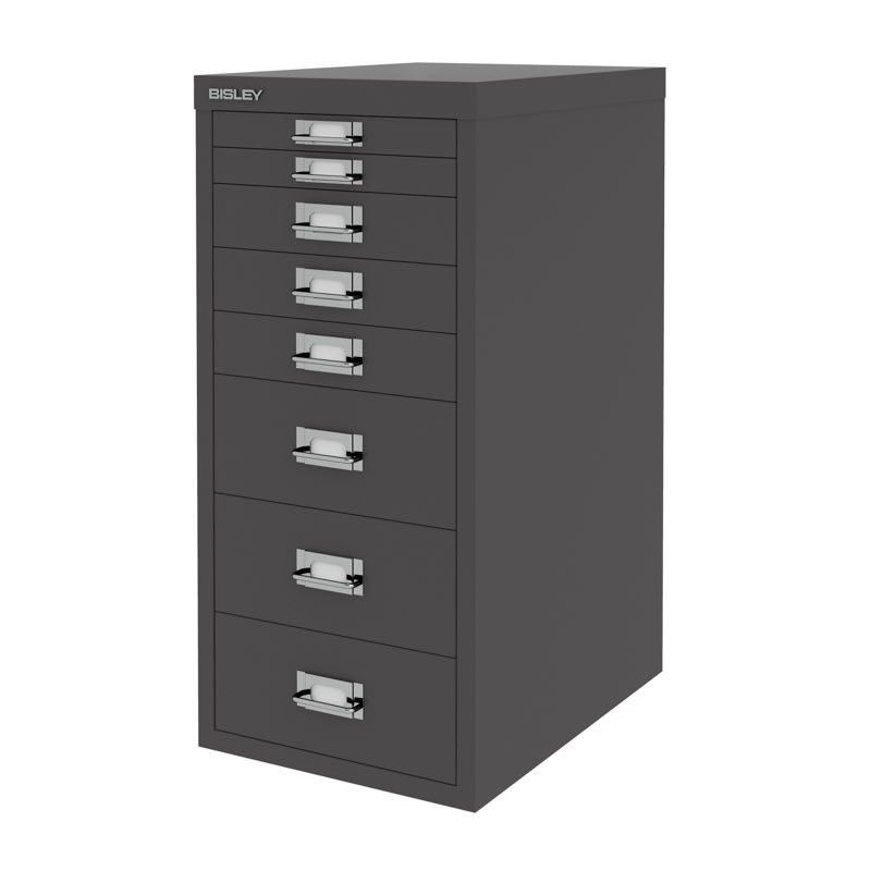 BISLEY Skuffesektion Classic 29 med 8 skuffer A4, grå. BISLEY skuffesektion Classic giver dig en pæn og praktisk opbevaring på kontoret. Skuffesektionen er fremstillet i lakeret stål og kan placeres direkte på gulvet eller kombineres med sokkel eller hjul. Findes i to grundstørrelser, baseret på de klassiske dokumentstørrelser A4 og A3 samt i 2-3 forskellige højder alt afhængigt af størrelsen. Hver skuffe er forsynet med etiketholder og det er muligt at tilkøbe skuffeindsatser, så du kan holde bedre orden på alle dine småting.