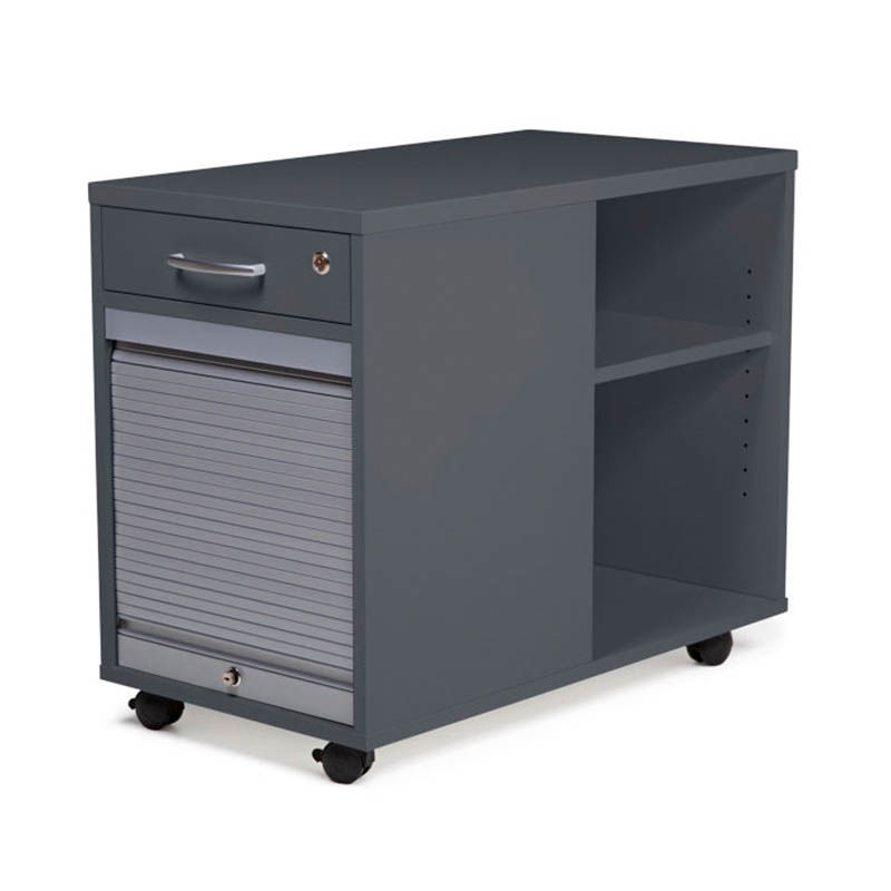 Skuffeelement Ulen med hylder og jalousi, åben ryg, mørkegrå. Fleksibel skuffeelement med skuffe och jalousiskab i laminat alternativt i finér. Åben ryg for let opbevaring. Flytbare hylder. Leveres monteret, kun håndtag og hjul eftermonteres