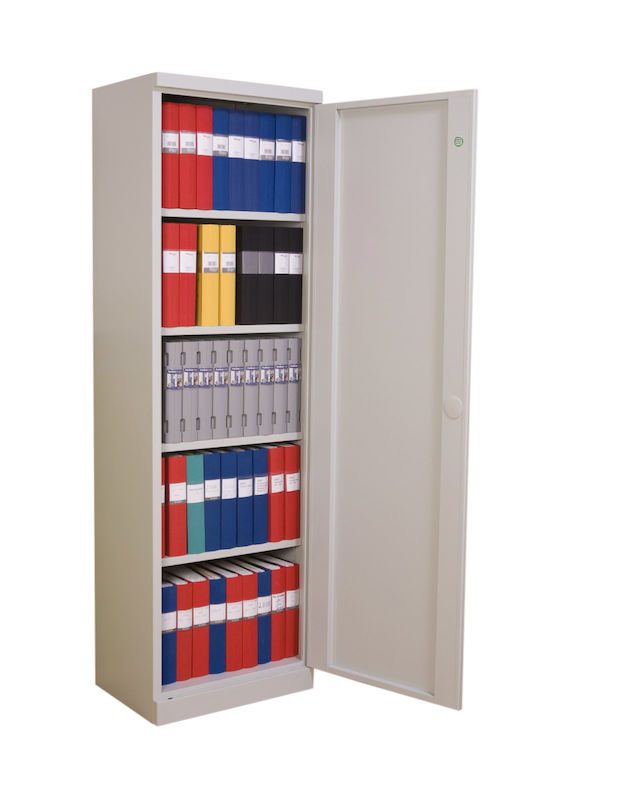 Indvendigt er stålskabet udstyret med dobbeltbøjede hyldeknægte. Hylderne kan højdejusteres i trin á 35 mm.