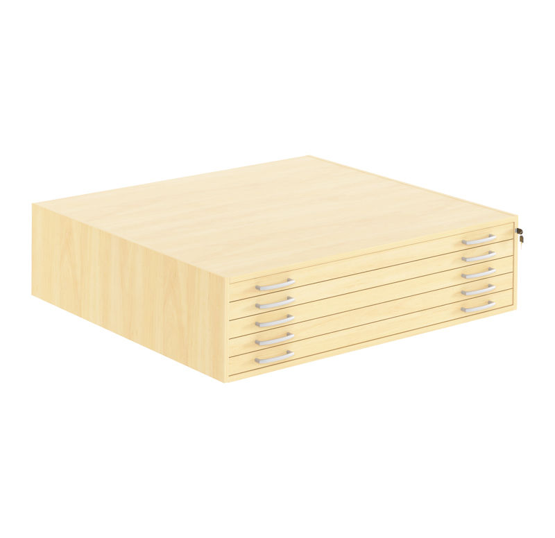 Tegningsskab Kolima A0, 5 skuffer. Sammensæt dit eget opbevaringsskab, helt efter dine egne behov og ønsker. Vælg det antal skuffesektioner, du ønsker, sektionerne sættes sammen eller fjernes, hvis behovet for opbevaringsplads ændres. Slut af med en topplade, og kombinér med en basissektion på sokkel eller benstel. De fem skuffer har sinksamlede hjørner.