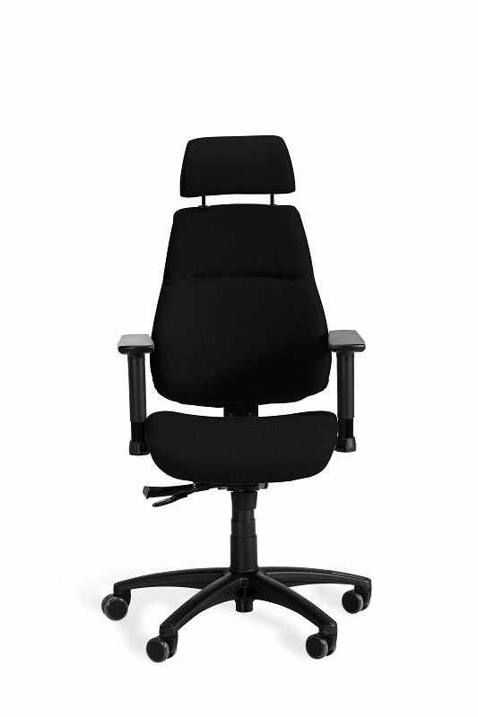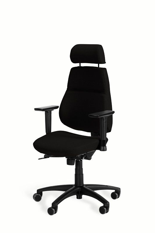 Kontorstol Sverigestolen 817 Ekonomi, inkl armlæn og nakkestøtte, sort. Komplet stol med justerbar sædedybde, justerbare armlæn og vipbar nakkestøtte. Synkronvippe, som enkelt låses/frigøres med samme regulering som højdejusteringen. Vippen er af sikkerhedstypen, der forhindrer "katapulteffekten", som kan opstå, når en let person sætter sig i en stol, der er indstillet til en tung person. Leveres med hjul til hårde gulve.