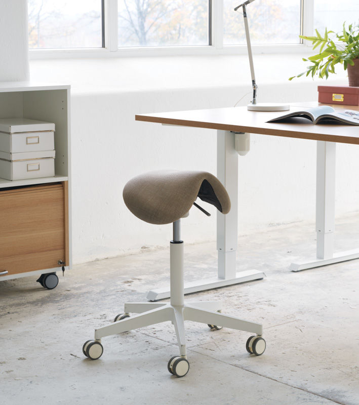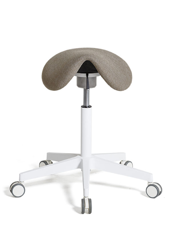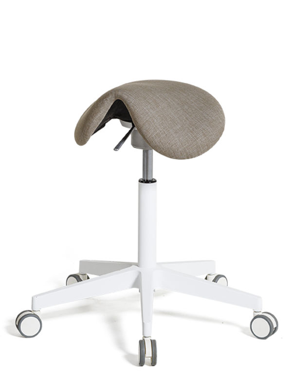 Sadelstol Skagen, flexmekanisme, beige sæde, hvidt stel. Sadelstol Skagen kombinerer en perfekt arbejdsstilling med en komfortabel siddestilling. Sadelstolen er formet som en cowboy sadel, polstret med formstøbt skum og beklædt med tekstil af højeste kvalitet. At sidde i ridende stilling giver en optimal ergonomisk kropsholdning, hvilket mindsker risikoen for muskel- og skeletbesvær. Sadelstolen Skagen fås med tre forskellige sædemekanismer som på hver sin måde sikrer en ergonomisk siddestilling hvilket betyder, at du kan sidde længe uden at føle træthed i kroppen. Sadelstolen fås med hvidt stel og man kan vælge mellem stofbeklædning i fem forskellige farver.