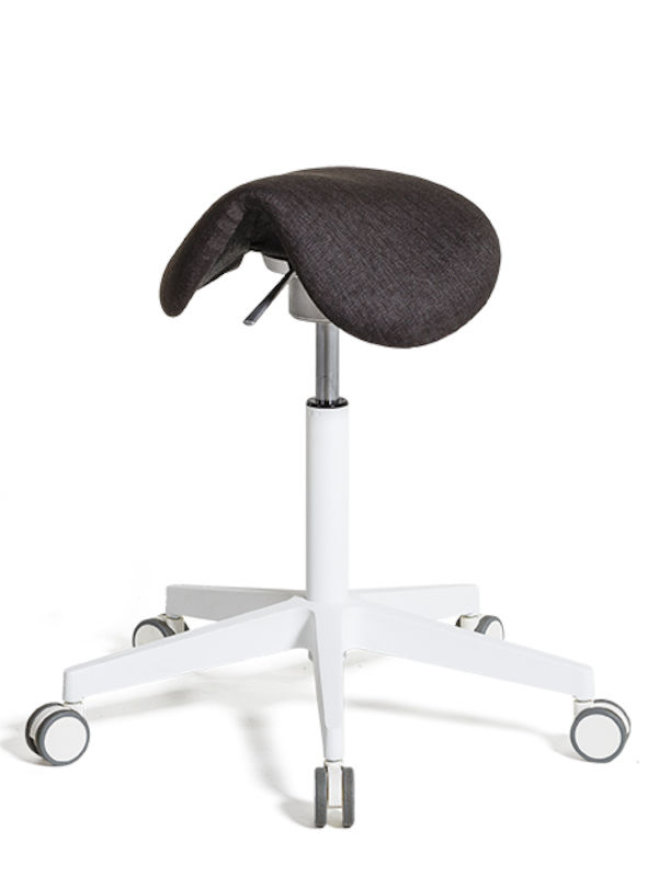 Sadelstol Skagen, vinklingsbar, antracitgrå sæde, hvidt stel. Sadelstol Skagen kombinerer en perfekt arbejdsstilling med en komfortabel siddestilling. Sadelstolen er formet som en cowboy sadel, polstret med formstøbt skum og beklædt med tekstil af højeste kvalitet. At sidde i ridende stilling giver en optimal ergonomisk kropsholdning, hvilket mindsker risikoen for muskel- og skeletbesvær. Sadelstolen Skagen fås med tre forskellige sædemekanismer som på hver sin måde sikrer en ergonomisk siddestilling hvilket betyder, at du kan sidde længe uden at føle træthed i kroppen. Sadelstolen fås med hvidt stel og man kan vælge mellem stofbeklædning i fem forskellige farver.