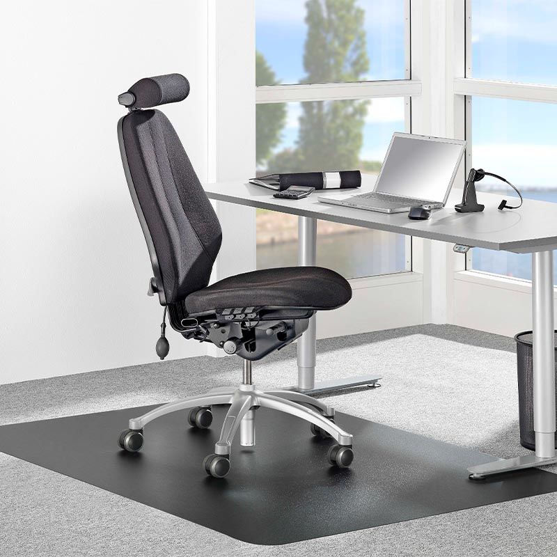 Stoleunderlag Essi LxB 1500x1200 mm, sort. Underlag Essi til kontorstol, som giver mulighed for at skifte mellem stående og siddende arbejde, fx ved et hæve sænkebord. En varieret arbejdsstilling ved skrivebordet er et must, hvis man vil forebygge skader. Når du sidder ned ved skrivebordet er det vigtigt at kontorstolen ruller let og uhindret og at gulvet eller tæppet beskyttes mod slitage fra kontorstolens hjul. Står du derimod op har du brug for et blødt og elastisk underlag for at aflaste benene og forebygge træthed. Det ergonomiske køreunderlag imødekommer disse kriterier. Stoleunderlaget til hæve sænkeborde er fremstillet af vinyl og har en fjedrende bagside, hvilket sikrer et blødt og spændstigt underlag. LxB 1500 x 1200 mm.