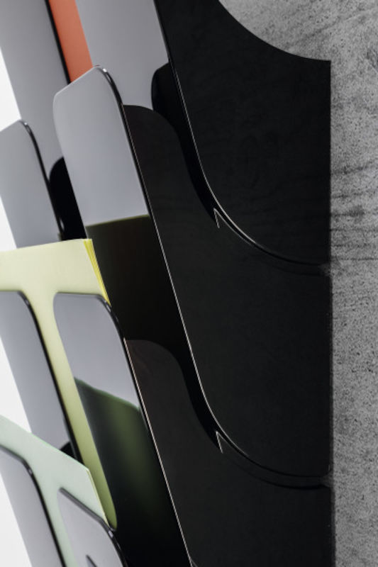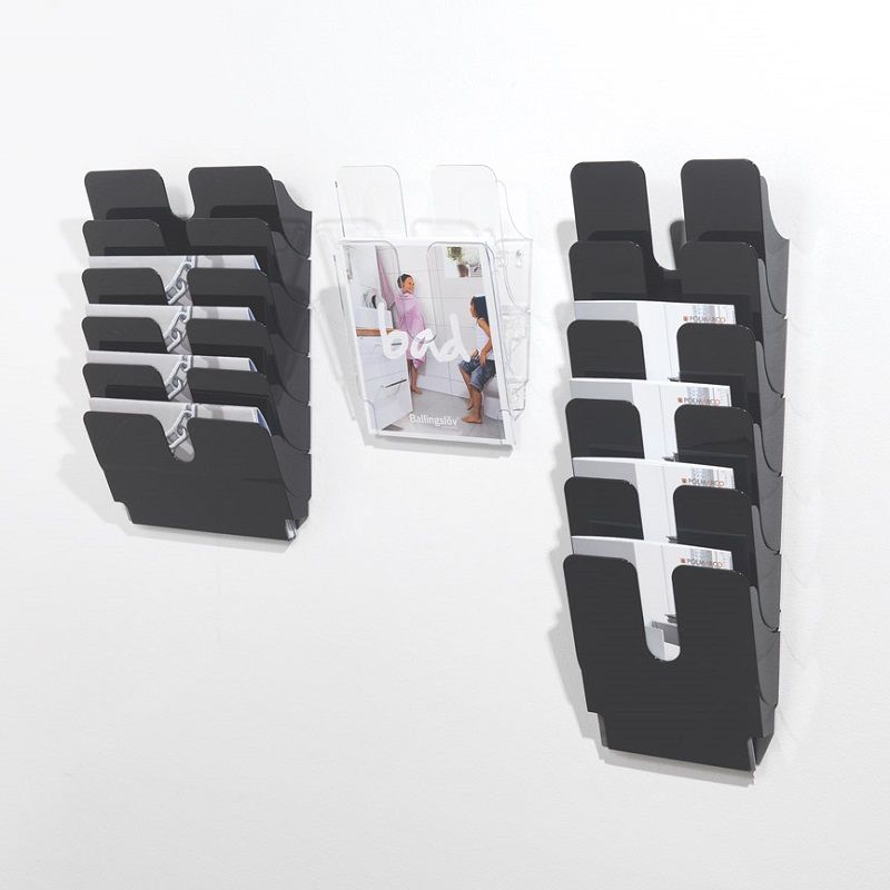 Brochureholder FLEXIPLUS til væg i A4 format. Til opbevaring af brochurer og formularer. Kan anvendes enkeltvis eller sammensættes efter behov. Skruer til vægmontering indgår. Maksimal kapacitet 23mm tykke bundter. Fås i stående eller liggende A4 format samt i sort eller transparent polystyrenplast. 2 fag eller 6 fag.