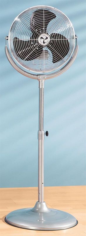 Gulvventilator, kan hæves og sænkes, 3 trin, fra 1 stk. Med stort luftvolumen og kraftig 3-trins ventilator, perfekt køling, også til større rum. Beskyttelsesgitter af forkromet stål. Lodret hældning i en vinkel på ca. 160° kan justeres og fastlåses for at justere luftstrømmen. Trinløs højdeindstilling fra 1200 til 1470 mm. Fod-Ø 450 mm.