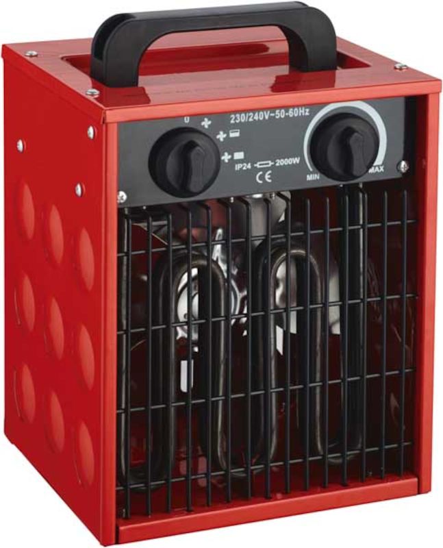 Robust varmeblæser. Effekt 2KW. Med 230V ventilationsmotor og effektvælger for fanehastighed på enten halv eller fuld effekt, varmelegemer i rustfrit stål, trinløs termostat og overophedningsbeskyttelse. Med forbindelseskabel og netstik. B 195, D 180, H 275 mm.