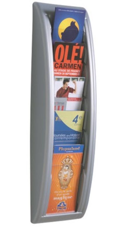 brochureholder til væg, 5 fag til 1/3 A4-format, aluminium sølv, 2-pak. Korpus af slagfast polystyrol. Forberedt til vægmontering. Klar rude giver fuldt overblik over brochurerne. Påfyldningsdybde 18 mm. 2 elementer pr. pakke.