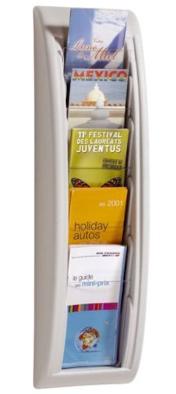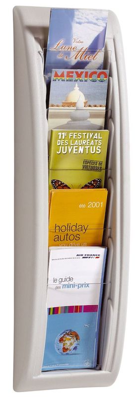 brochureholder til væg, 5 fag til 1/3 A4-format, grå, 2-pak. Korpus af slagfast polystyrol. Forberedt til vægmontering. Klar rude giver fuldt overblik over brochurerne. Påfyldningsdybde 18 mm. 2 elementer pr. pakke.