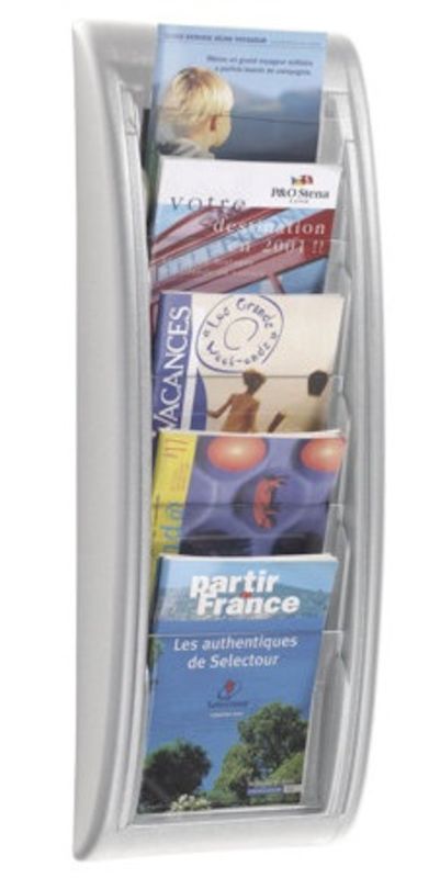 brochureholder til væg, 5 fag til A5-format, aluminium sølv, 2-pak. Korpus af slagfast polystyrol. Forberedt til vægmontering. Klar rude giver fuldt overblik over brochurerne. Påfyldningsdybde 18 mm. 2 elementer pr. pakke.