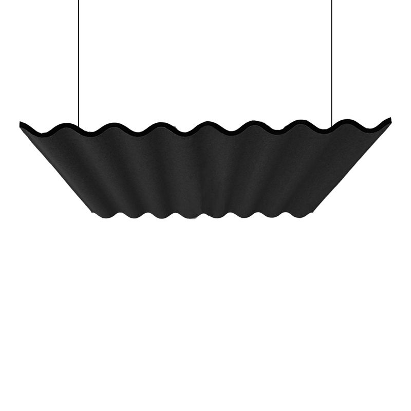 Lydabsorbent Scala Ceiling uden belysning, LxBxD 1600x1207x60 mm, Blazer sort. Lydabsorbent Scala Hanging. Den loftmonterede version af Scala forhindrer lydbølgerne i at fortsætte opad i rummet, hvilket bidrager til en mere behagelig lyd, f.eks. i et kontor- eller restaurantmiljø. Loftmodulerne er lavet af støbte paneler, der består af en lydabsorberende kerne og stofdækket ydre og fås med eller uden integreret lys. Loftabsorbentens form er inspireret af bølgepap. Formen er baseret på sinuskurven, der skaber naturlige luftspalter bag produktet, hvilket igen skaber et produkt med bedre absorption. Sinuskurven giver produktet en større absorberende overflade, end hvis den var helt glat. Akustikpladen er delvist lavet af genbrugt stofaffald og leveres med et wiresæt til justerbar ophængning. Fås i 6 forskellige farver i stof Blazer, vælg den variant som passer dig bedst.