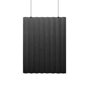 Lydabsorbent Scala Hanging, lodret, LxBxD 1207x1600x60 mm, sort. Lydabsorbent Scala Hanging. Den lodret hængende lydabsorbent Scala er dækket med stof på begge sider. Modulerne er lavet af støbte paneler bestående af en lydabsorberende kerne, der monteres i loftet via en diskret wire, der er fastgjort i toppen af modulet. Det sorte ophængningsbeslag og wiresættet er inkluderet som standard. Den frithængende absorbent bidrager til et mere behageligt lydmiljø, for eksempel i et kontor- eller restaturantmiljø, og fås i flere forskellige størrelser. Produktets form er inspireret af bølgeblik. Formen er baseret på sinuskurven, der skaber naturlige luftspalter bag produktet, hvilket igen skaber et produkt med bedre lydabsorption. Sinuskurven giver produktet en større absorberende overflade, end hvis den var helt glat. Akustikpladen er delvist lavet af genbrugt stofaffald og få i 6 forskellige farver i stof Blazer.