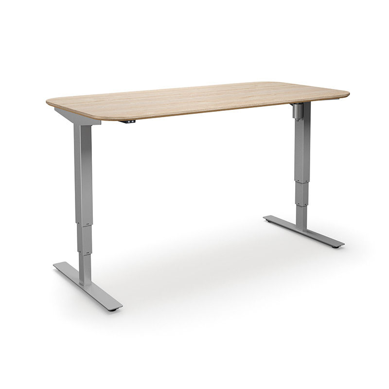 Hæve sænkebord Atlanta Trend, rundt hjørne, LxB 1600x800 mm, eg / sølv. Hæve sænkebordet Atlanta Trend er et solidt højdejusterbart skrivebord i et enkelt, nordisk og stilrent design. Et sikkert valg for den der vil have et smukt højdejusterbart bord, der skal holde længe.
