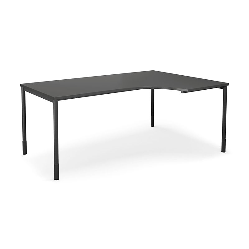 Duo-C med hjørneplade LxB 1800x1200 mm. Skrivebord med laminatbordplade og runde ben som er justerbare i højden 700-800 mm inkl. bordpladen. Skrivebordet kan suppleres med en hængende skuffesektion. Laminat: Plade belagt med bøge-, birke-, ege- eller farvet dekor med kantliste af ABS-plast. Farven er konstant, dvs. at udseendet ikke ændres med tiden.
