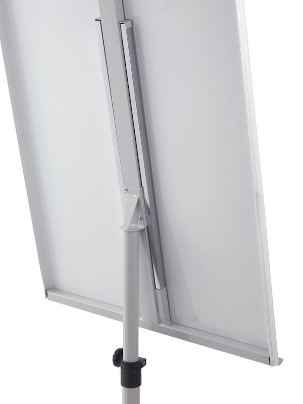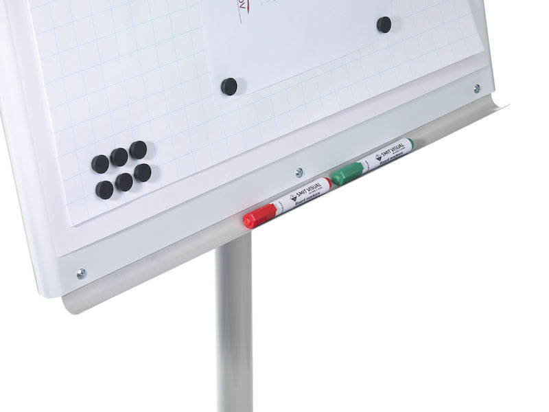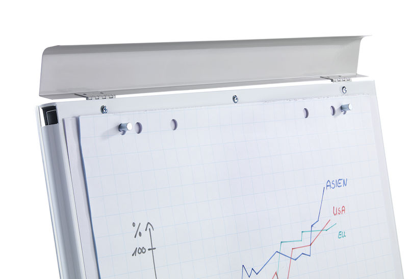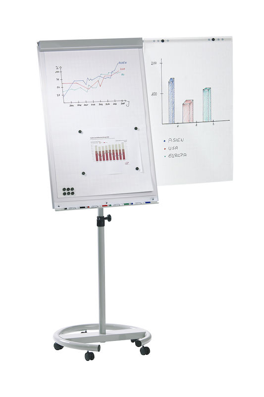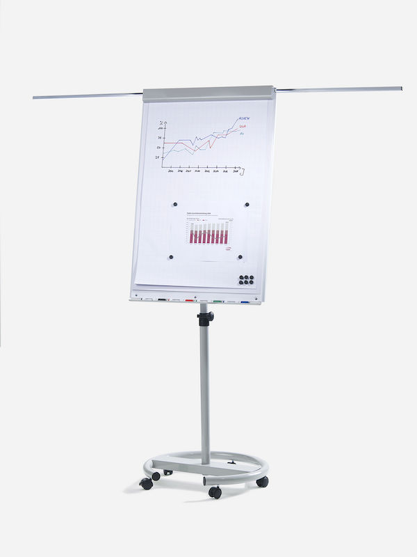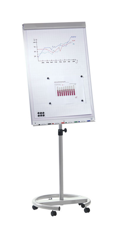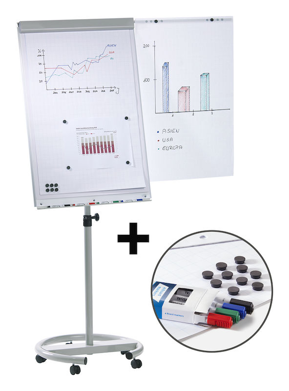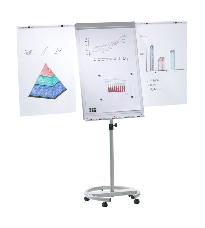 Flipover Ilona. Med lynskiftblokholder til alle gængse flipoverblokke. To magnetiske papirholdere, der kan trækkes ud, i siden, udvider om nødvendigt præsentationsområdet til det tredobbelte. Praktisk metalopbevaringsliste til penne etc. Rund fod, Ø 640 mm, praktisk åbning foran. 5 drejelige hjul, hvoraf 3 har bremser. Samlet højde maks. 2000 mm. Medfølger: 1 stk. flipoverblok med universalhuller, træfri, hvid, 80 g/m², bleget uden klor, format 650 x 1000 mm. Kvadreret front, 25 mm, blank bagside. 4 stk. flipoverpenne i sort, rød, grøn og blå. 10 runde magneter, Ø 20 mm, farve sort.