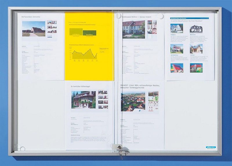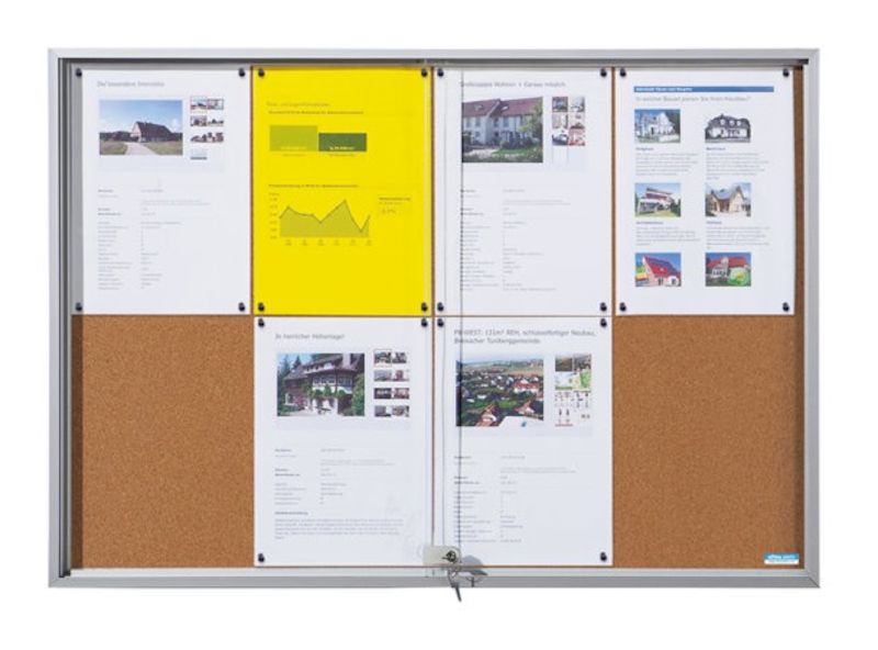 Opslagsskab med skydedøre, udvendig BxHxD 906 x 947 x 50 mm, korkbagvæg. Ideelt, hvor pladsen er trang. Ramme af aluminium, sølveloxeret. 4 mm ESG-sikkerhedsglas. Sikkerhedscylinderlås (2 nøgler). Byggematerialeklasse B1 (svært antændelig) DIN 4102. Ideelt til skoler, offentlige bygninger og myndigheder. Udvendig dybde: 50 mm. Brugbar indvendig dybde: 24 mm.