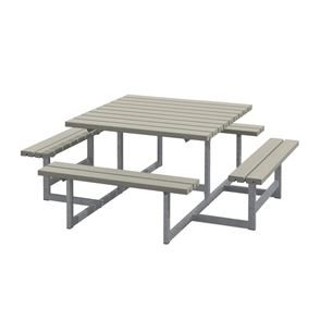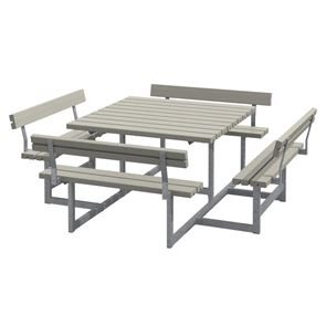 Bord bænkesæt Ela, LxD 2240 x 2240 mm, med 4 ryglæn, sort. Denne gruppebænk har et moderne og enkelt møbeldesign med et naturligt look. Bord og bænke er udført som en enhed, har plads til op til 8 personer og er velegnet til permanent brug udenfor. Fås med eller uden ryglæn og er udført i FSC®-certificeret nåletræ og et varmgalvaniseret stålrørsstel. Takket være den stabile konstruktion har dette møbel en lang levetid – også ved daglig brug. Gruppebænken er ideel til pause- og opholdsområder udenfor i virksomheder, hos offentlige instanser samt i park- og fritidsanlæg.