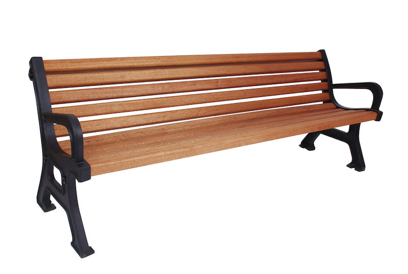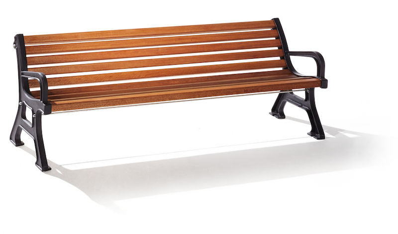 Havebænk Baran, med armlæn, lægter af merantitræ. Stel af støbejernssidedele, pulverlakeret.