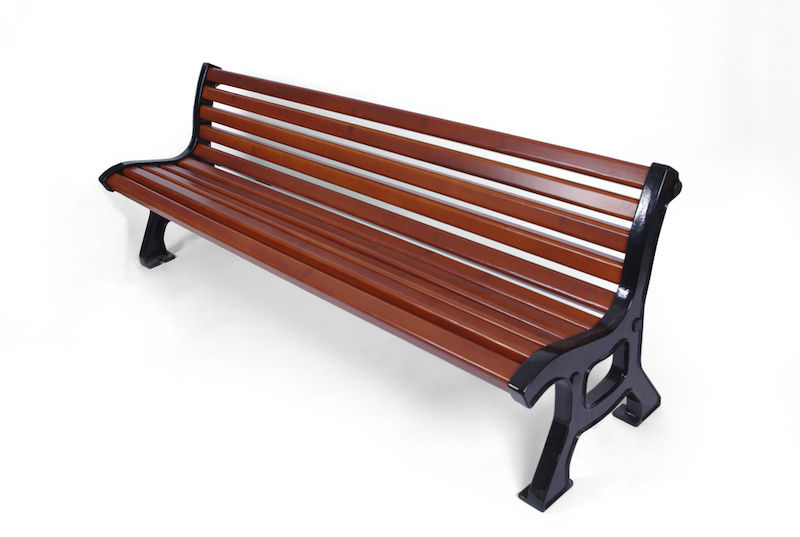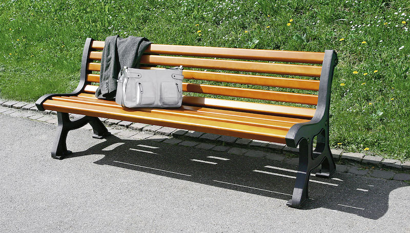 Havebænk Baran, uden armlæn, lægter af merantitræ. Stel af støbejernssidedele, pulverlakeret.