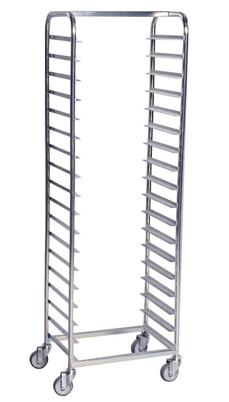 Elforzinket stabil bakkevogn med plads til 18 eller 36 bakker. Også velegnet som bakkestativ.