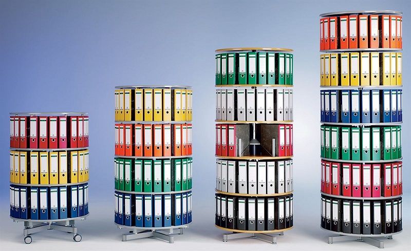 Ringbindskarruseller, Ø 1000 mm. Hele hylden kan drejes Til opbevaring af ca. 80% flere mapper i forhold til lignende reoler Let, støjfri bevægelse Ubesværet drejning med kuglelejer. Stabil stålkonstruktion, pulverlakeret i lysegrå (RAL 7035). Hylder af coatede spånplader. En kant forhindrer, at mapperne rutsjer ud. En dækplade beskytter mapperne mod støv. Lastkapacitet pr. hylde 70 kg. Samlet belastning på 300 kg. Montering af hjul kun tilladt på mappestativer med maks. 4 etager. Hjul købes som tilbehør.