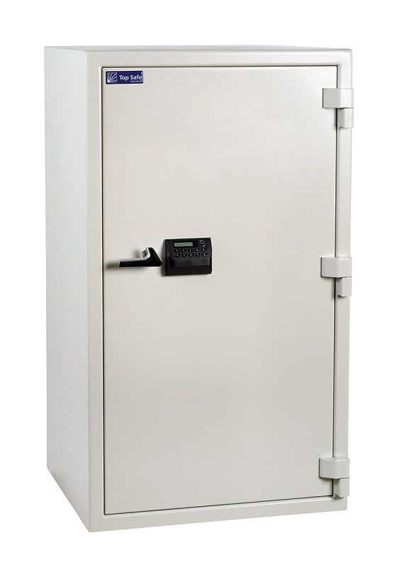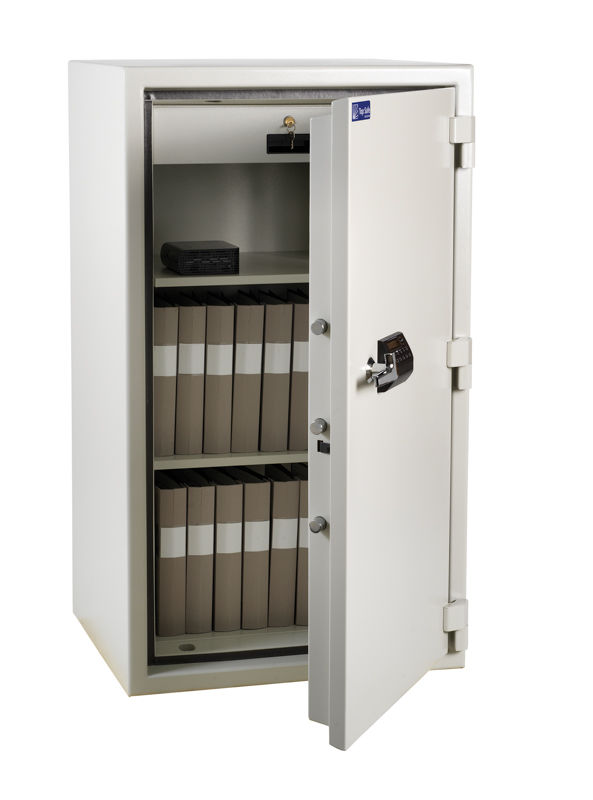 Dokumentskab ES, med aflåselig skuffe, model ES 200. ES-serien består af brandsikrede dokumentskabe, der beskytter papir ved brand. Skabene er testede til at beskytte papir i 2 timer i ca. 1000 graders varme. Skabene er indrettet med flytbare hylder til A4-mapper samt en aflåselig skuffe. Skuffen kan let afmonteres, så pladsen kan udnyttes til opbevaring af mapper. Kan tages ud på alle modeller undtagen ES700. Skabene er som standard udstyret med elektronisk kodelås med to udskiftelige koder samt tidsforsinkelse ved gentagne forkerte indtastninger af koden. Låsen er borebeskyttet med en sprængsikring, som låser riglemekanismen ved forsøg på indbrud. Forankringssæt medfølger, forberedt til boltning i bunden. Findes i forskellige størrelser.