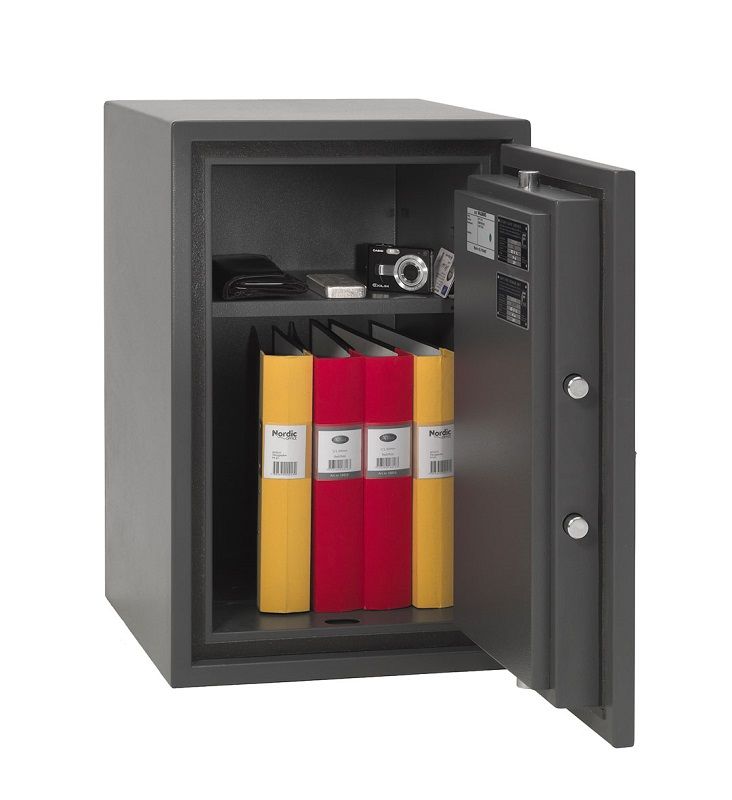 Værdiskab BRF er et kraftigt værdiskab, som yder god beskyttelse mod både tyveri og brand. Skabet er godkendt i henhold til europæisk standard EN 14450 i sikringsklassen S2. Værdiskabet er brandgodkendt i henhold til EN 15659 LFS 30P. Skabet kan således anbefales hvis man har et begrænset sikringsbehov, men gerne vil have et skab som både beskytter mod brand og tyveri. Skabet vejer forholdsvist lidt, man behøver derfor ikke tage specielt hensyn til gulvets bæreevne. Det anbefales atl pengeskabe med en vægt under 1000 kg boltes fast til væg eller gulv. Skabet har hylder som standard. Man kan vælge mellem nøglelås og elektronisk kodelås. Forankringssæt medfølger, forberedt for boltning i bunden.