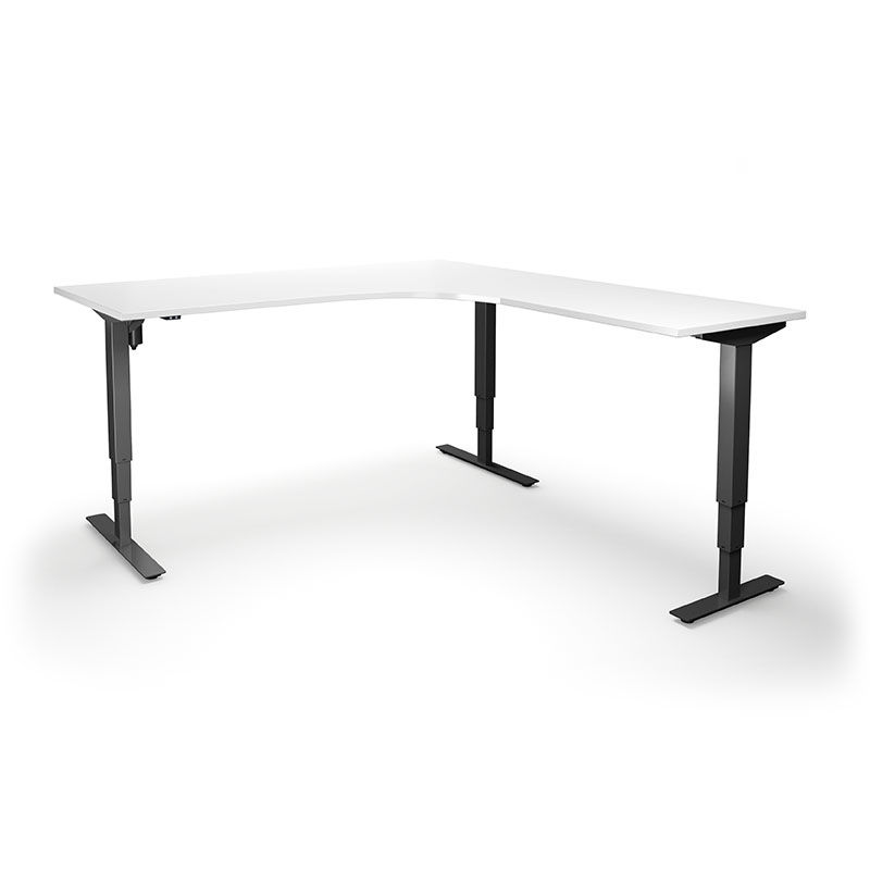 Hæve sænkebord Atlanta, højre, 2000x1800, hvid / sort. Et solidt højdejusterbart hjørneskrivebord i et moderne, enkelt og stilfuldt design til en fornuftig pris. Et sikkert valg for den der vil have et højdejusterbart bord, der skal holde længe.