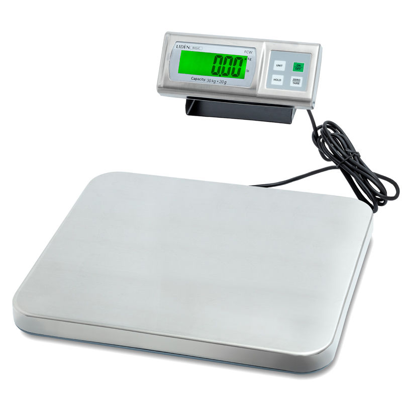 Pakkevægt FCW. Prisbillig vægt til tørre miljøer. Vejeplatform i rustfrit stål. Baggrundsoplyst LCD-display. Vælg pakkevægt med kapacitet 60 kg / 0,05 kg eller 150 kg / 0,2 kg. Net tilslutning eller batteridrift.