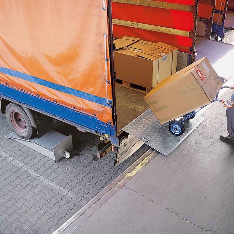 Kørerampe med anslagsnæb og håndtag, rampelængde 1200 mm, lastkapacitet 1200 kg. anslagsnæb og håndtag til sikring mod at glide Platform med skridsikker køreflade 2 gribehuller til at bære. Iht. brancheorganisationen må stigningen på køreramper ikke overskride 12,5%.