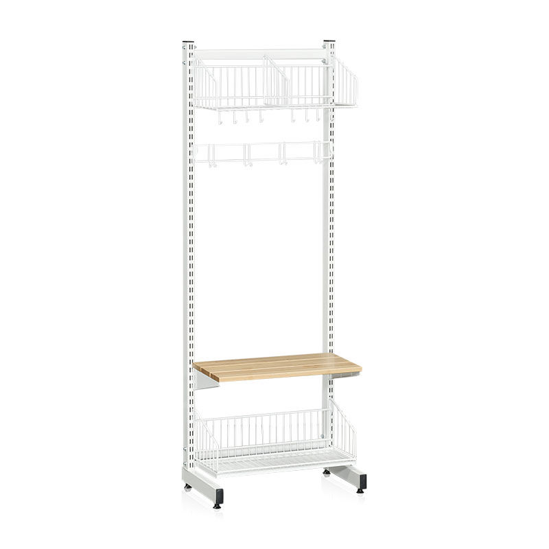 Garderobestativ Savalen enkelsidet, bredde 600 mm, hvid, model A, grundsektion. Praktisk og fleksibel garderobestativ med forskellige muligheder. Findes både som gulvstativ og vægstativ. Byg din egen løsning med grund- och tilbygningssektioner. Kan indstilles for hver 25 mm. Gulvstativet har indstillelige fødder. Model A: Skohylde med drypbakke, bænk, knagerække og hattehylde i tråddesign.